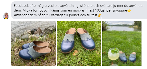"Feedback efter några veckors användning: skönare och skönare ju mer du använder dem. Mjuk för fot och känns som en mockasin fast 100 gånger snyggare. Använder dem både till vardags, på jobbet och på fest."